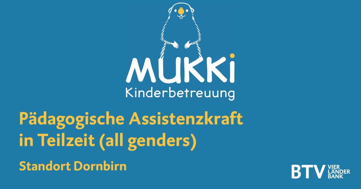 MUKKI - so heißt die neue Kinderbildungseinrichtung der BTV Vier Länder Bank AG (BTV), die ab September 2025 im Herzen von Dornbirn ihren Betrieb aufnehmen wird. Gesundheit, Bewegung und Kreativität stehen im Zentrum des modernen, pädagogischen Konzepts. Für den Aufbau der Kinderbetreuungseinrichtung suchen wir per sofort eine Assistenzkraft in Teilzeit.